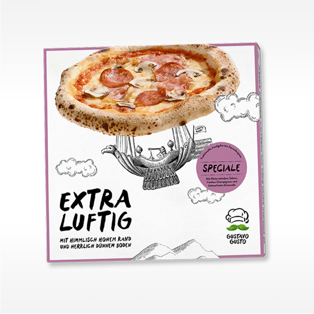 57 % Teig (Weizenmehl, Wasser, Weizenmalzmehl, natives Olivenöl extra, Salz, Frischbackhefe), 14 % laktosefreier, schnittfester Mozzarella* (pasteurisierte Kuhmilch, Salz, mikrobieller Labaustauschstoff, Milchsäurebakterienkulturen), 13 % Tomatensoße (gehackte Tomaten, Tomatenpüree, Salz, natives Olivenöl extra, Gewürze), 6 % Champignons, 4% gekochter Hinterschinken (Schweinefleisch, Nitritpökelsalz (Salz, Konservierungsstoff: Natriumnitrit), Dextrose, Stabilisator: Diphosphate; Speisewürze (Wasser, hydrolisiertes Pflanzeneiweiß (Mais, Raps), Salz), Antioxidationsmittel: Natriumascorbat, Gewürzextrakte), 3 % Salami (Schweinefleisch, Schweinespeck, Salz, Dextrose, Gewürzextrakte, Gewürze, Antioxidationsmittel: Extrakt aus Rosmarin, Natriumascorbat; Konservierungsstoff: Natriumnitrit; Reifekulturen, Buchenholzrauch), Hartweizengrieß. *Laktosegehalt <0,1 g/100g