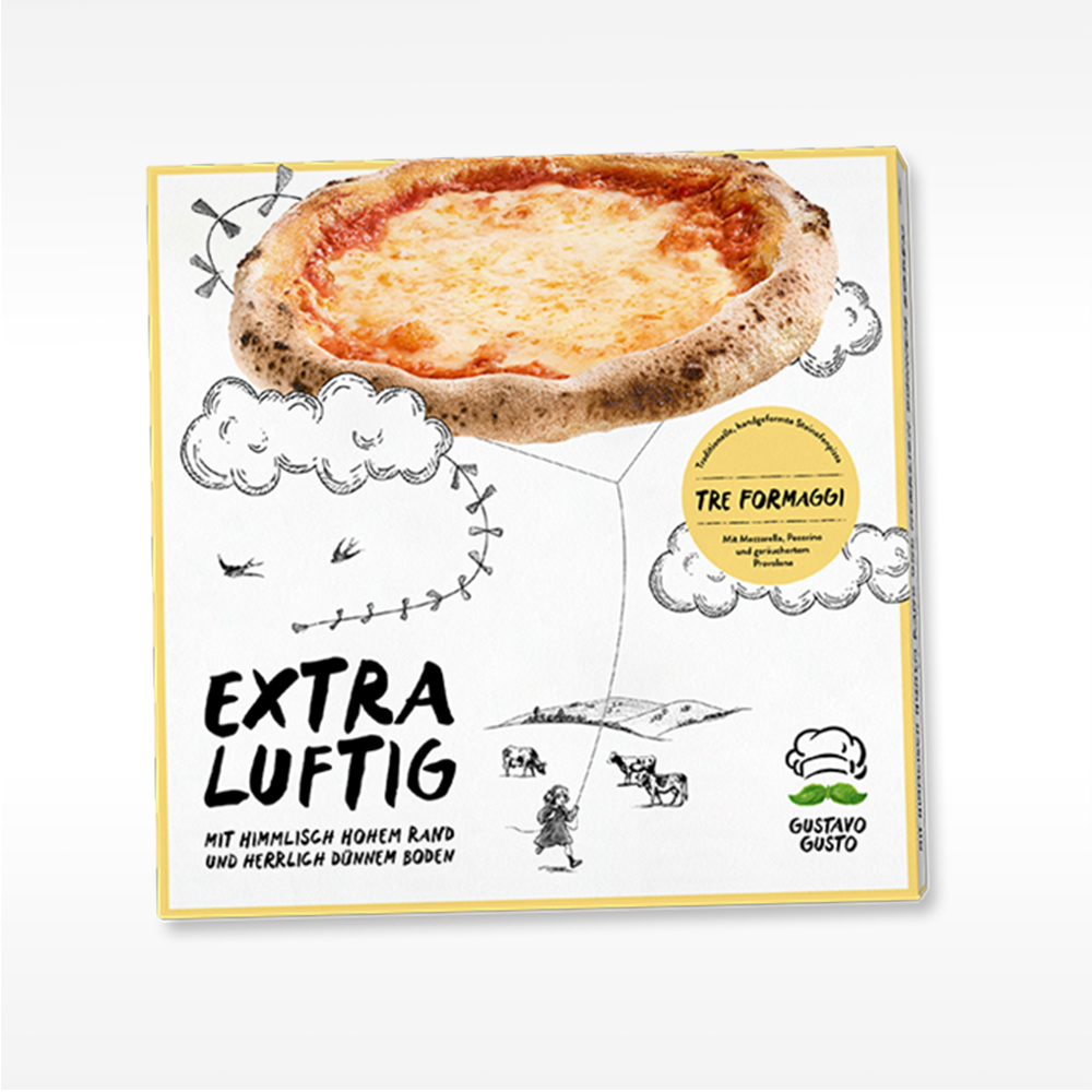 65 % Teig (Weizenmehl, Wasser, Weizenmalzmehl, natives Olivenöl extra, Salz, Frischbackhefe), 15 % Tomatensoße (gehackte Tomaten, Tomatenpüree, Salz, natives Olivenöl extra, Gewürze), 10 % schnittfester Mozzarella (pasteurisierte Kuhmilch, Salz, mikrobieller Labaustauschstoff, Milchsäurebakterienkulturen), 3 % geräucherter Provolone (pasteurisierte Kuhmilch, Salz, mikrobielles Lab, Milchsäurebakterienkulturen, Rauch), 3 % Pecorino Hartkäse, Hartweizengrieß.