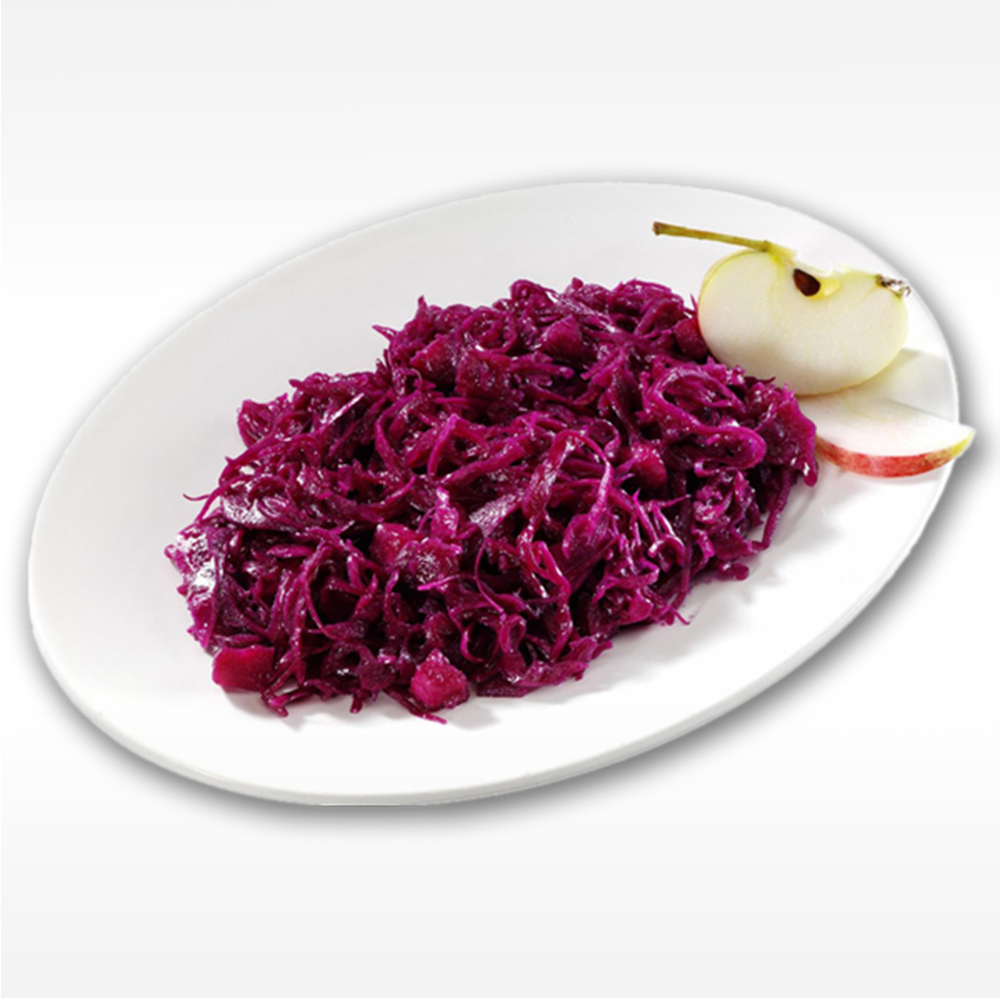 Rotkohl 64 %, Zucker, Rapsöl, Äpfel 6 %, Branntweinessig, Zwiebeln, Speisesalz, Pfeffer
