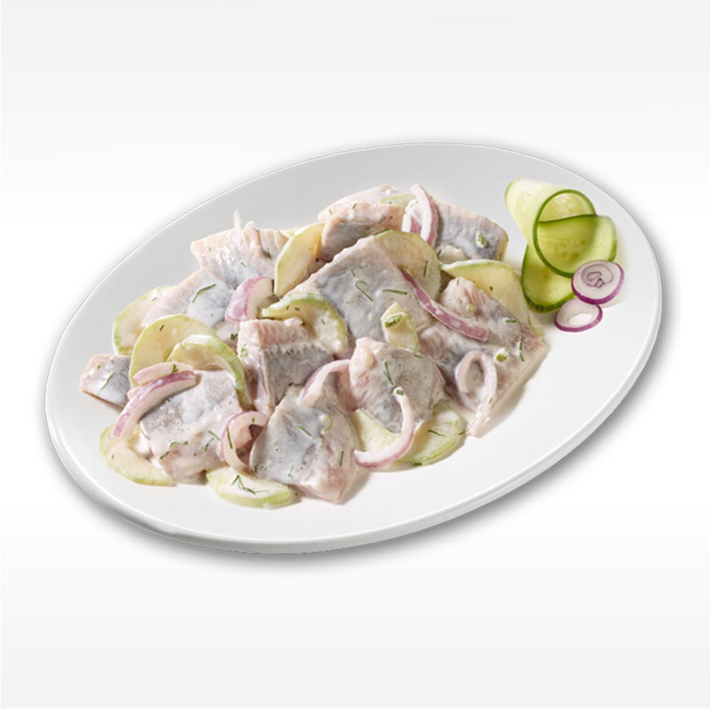 Matjeshappen nordische Art 47 % [Hering1, Speisesalz, Dextrose, Säuerungsmittel: Natriumcitrat, Citronensäure, Glucono-delta-Lacton, Ascorbinsäure; Antioxidationsmittel: Natriumascorbat; Rote-Betesaftkonzentrat**], Rapsöl, Gurken 11 %, rote Zwiebeln 10 %, Sahnejoghurterzeugnis 7 % [Sahne (10 % Fett), Milcheiweißerzeugnis, modifizierte Stärke, Speisegelatine (Rind), Joghurtkulturen], Zucker, Eigelb, Tafelmeerrettich [Meerrettich, Branntweinessig, Wasser, Rapsöl, Säuerungsmittel: Citronensäure; Speisesalz, Dextrose], Dill, Branntweinessig, Senf [Wasser, Senfsaat, Branntweinessig, Speisesalz, Zucker, Gewürze], Speisesalz, natürliches Aroma. 1Herkunft: Nordostatlantik FAO 27, **als färbendes Lebensmittel