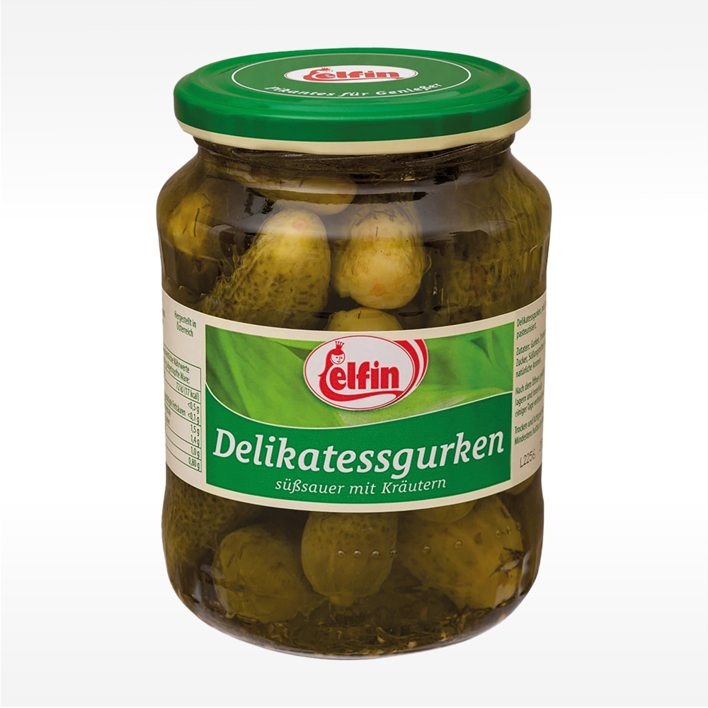 Gurken, Trinkwasser, Säureessig, Speisesalz, Zucker, Süßungsmittel: Saccharin, Dill, Senfkörner, natürliche Aromen, Konservierungsmittel: E211