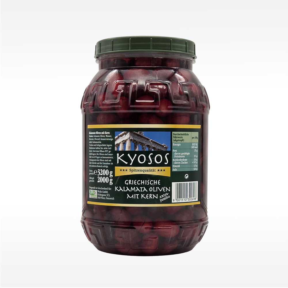 Kalamata Oliven, Wasser, Meersalz, Olivenöl, Konservierungsmittel: Kaliumsorbate