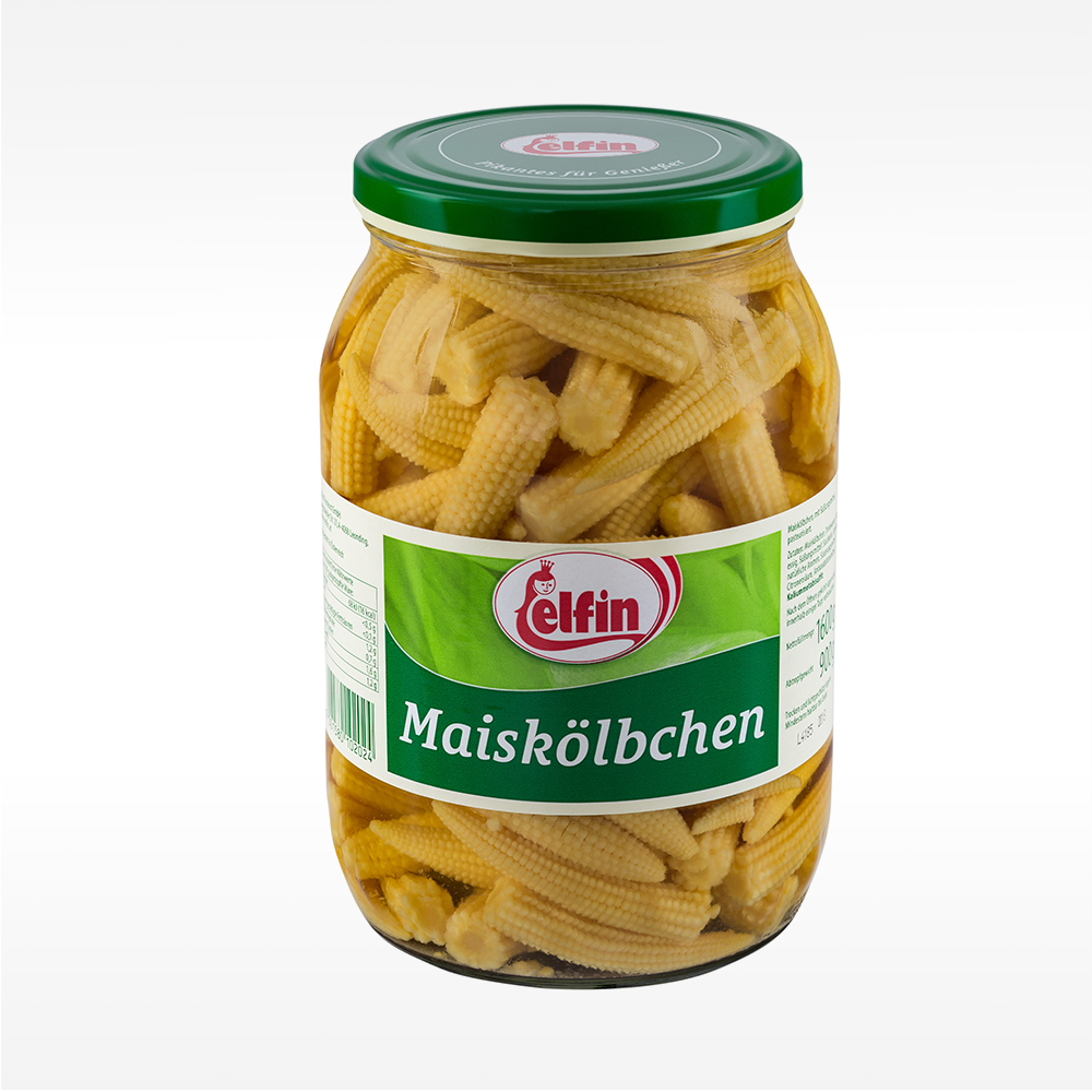 Die Maiskölbchen extra klein von Elfin sind eingelegt in einem Aufguss bestehend aus Säureessig, Salz und Zitronensäure.