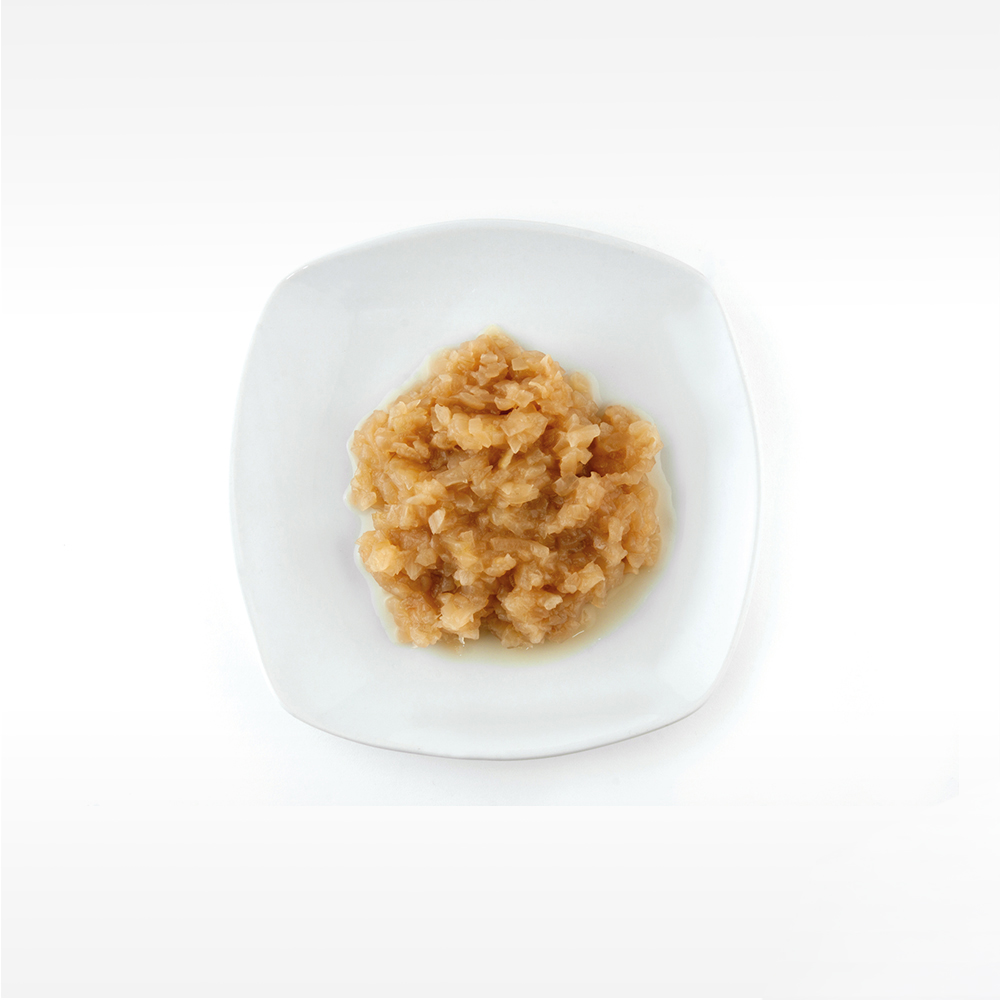 Zwiebel geschält, gehackt in ca. 6x6 mm große Stückchen; gedünstet im eigenen Saft ohne Zugabe von Fett und abgepackt in versiegelte 3 kg Beutel. Produkt hergestellt aus frischen Zwiebeln.
