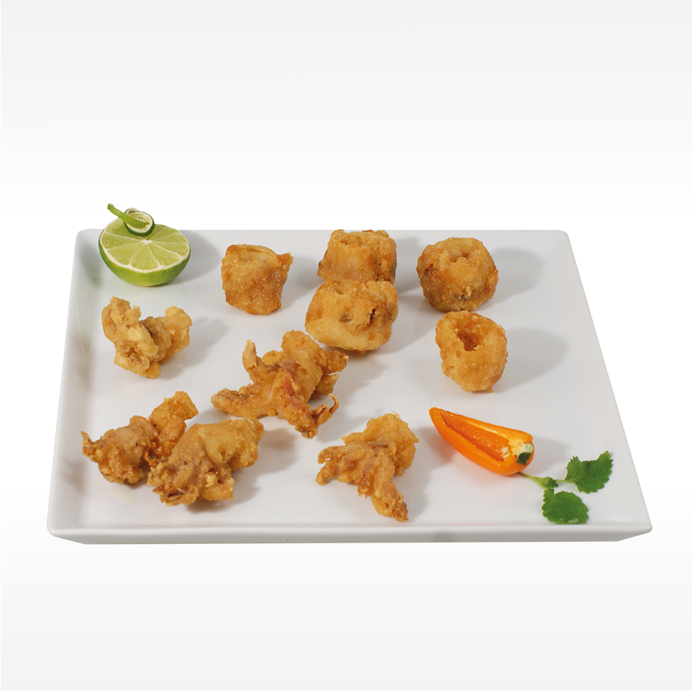 70% TINTENFISCH (Loligo edulis), 30% Panade (Reismehl, WEIZENmehl, Tapioka, Pfeffer, Salz, Zucker, Verdickungsmittel (E415), Backpulver (E500i, E500ii))