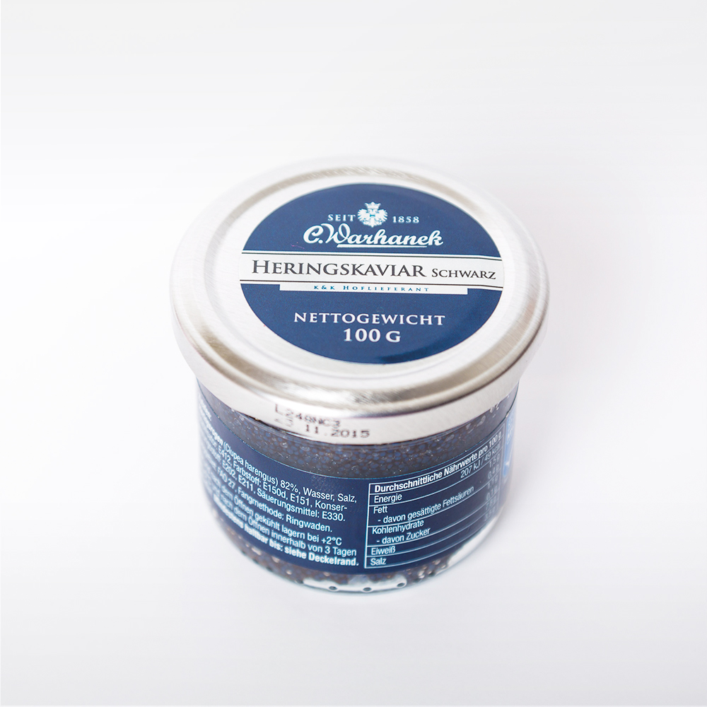 HERINGSROGEN (Clupea harengus) 80%, Wasser, Speisesalz, Essig aus Essigsäure, Feuchthaltemittel: E420(ii), Konservierungsstoff: E211, Verdickungsmittel: E412, Farbstoffe: E141, E150d, E163, E151.