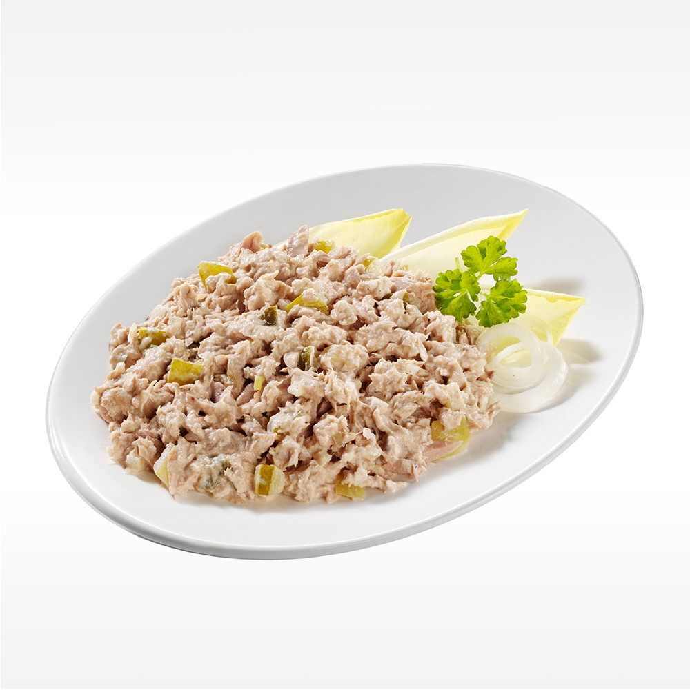 Thunfisch, feine Gurkenwürfel und frische Zwiebeln in einer herzhaft gewürzten Mayonnaise