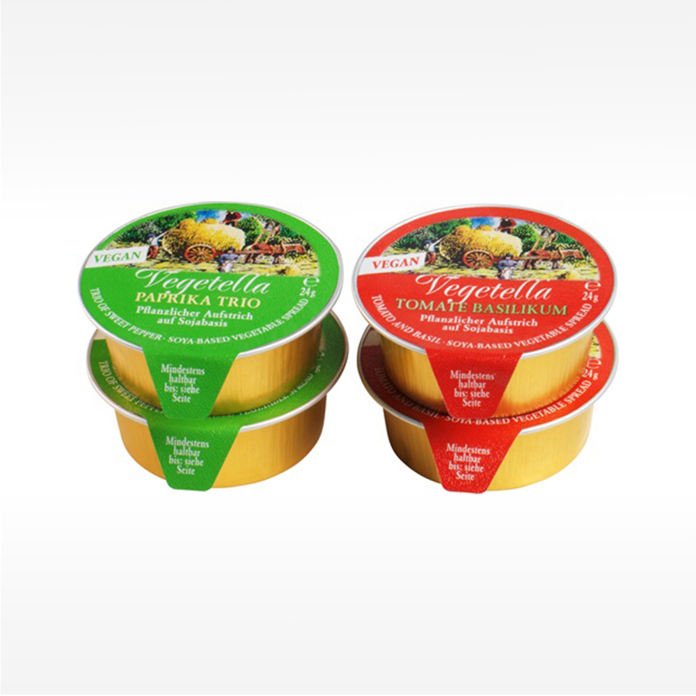 Zutaten Paprika Trio: SOJABOHNEN gekocht 29%, Paprika 25% (in veränderlichen Gewichtsanteilen: grüner, gelber und roter Paprika), Wasser, Sonnenblumenöl, Tomatenmark doppelt konzentriert, Kartoffelflocken (Kartoffeln, Gewürzextrakte), Speisesalz, Zitronensaftkonzentrat, Kräuter, Gewürze, Antioxidationsmittel: Ascorbinsäure