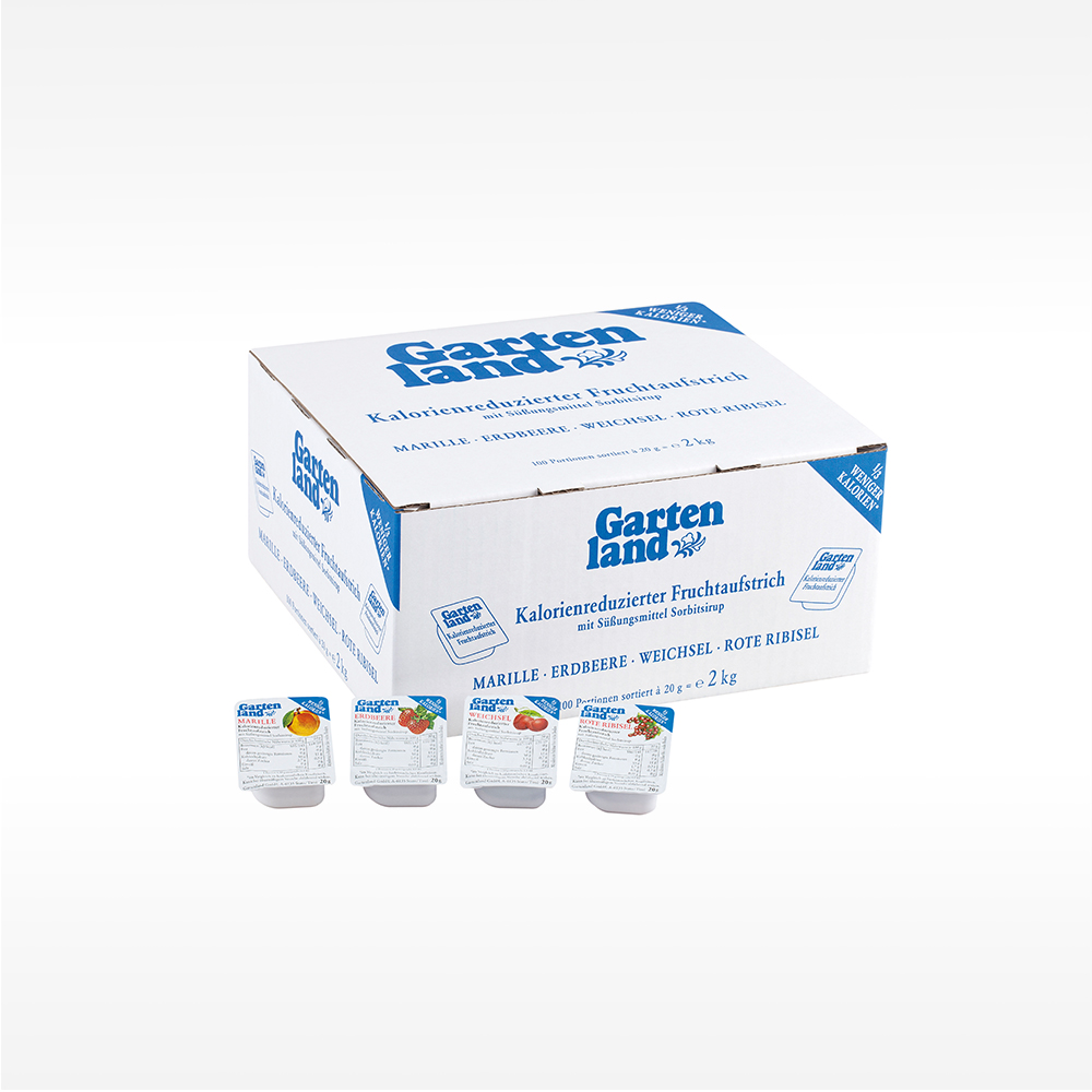 Süßungsmittel Sorbitsirup, 35 % Früchte (Marillen [Aprikosen], Erdbeeren, Weichseln [Sauerkirschen] oder Rote Ribisel [Johannisbeeren]), Geliermittel Pektin, Säuerungsmittel Citronensäure, Konservierungsstoff Kaliumsorbat
