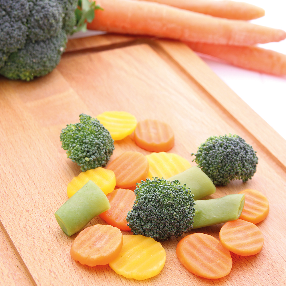 Blanchiert, Gemüsemischung aus Karottenscheiben gelb und orange, Romanobohnen, Broccoli