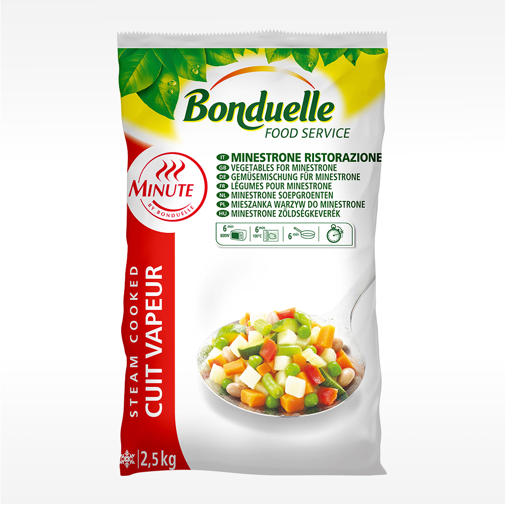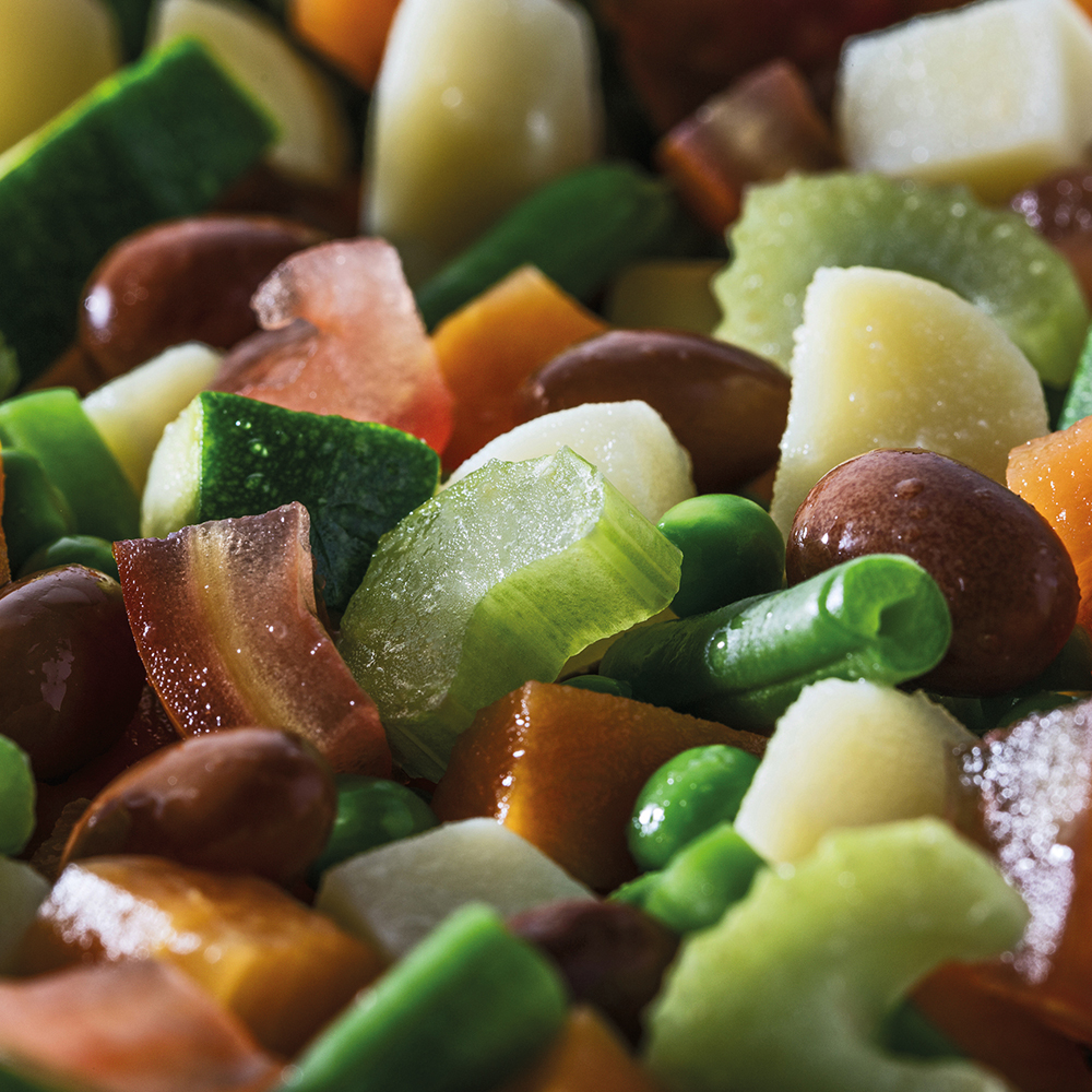 Minute dampfgegart, Kartoffeln gewürfelt, Karotten gewürfelt, Grüne Bohnen, Tomaten gewürfet, Zucchini grün, Erbsen, Sellerie, Borlotti-Bohnen,
