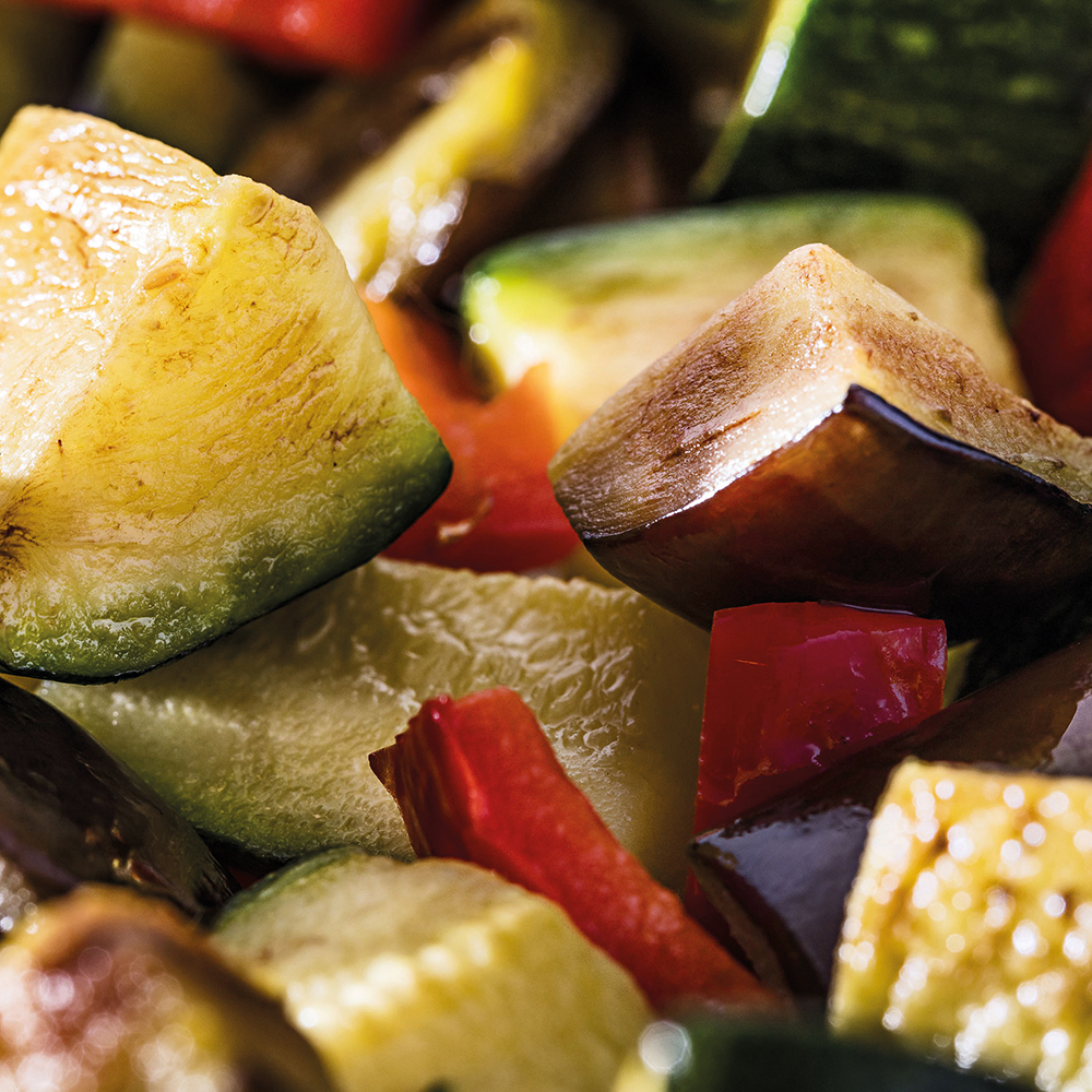 Gemüsemischung frittiert: Zucchini, Auberginen, roter Paprika, Sonnenblumenöl. Spuren von Sellerie möglich.