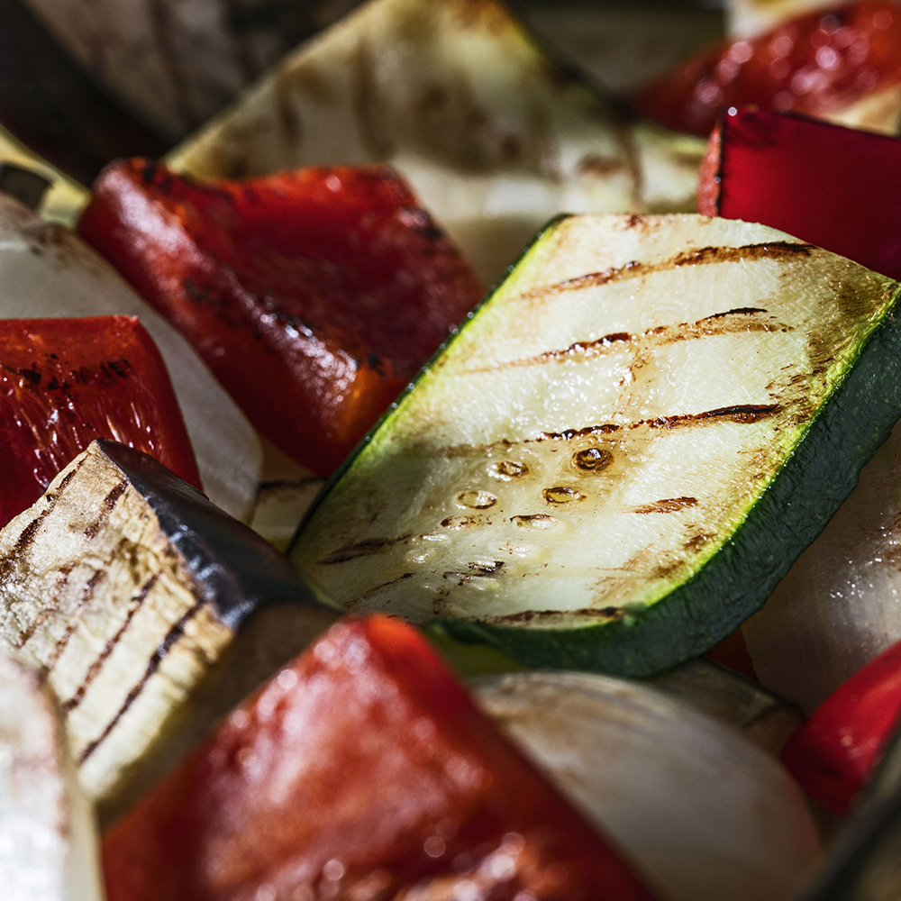 Zutaten: Mischung gegrillter Gemüse: roter Paprika, Auberginen, Zucchini, Zwiebeln
