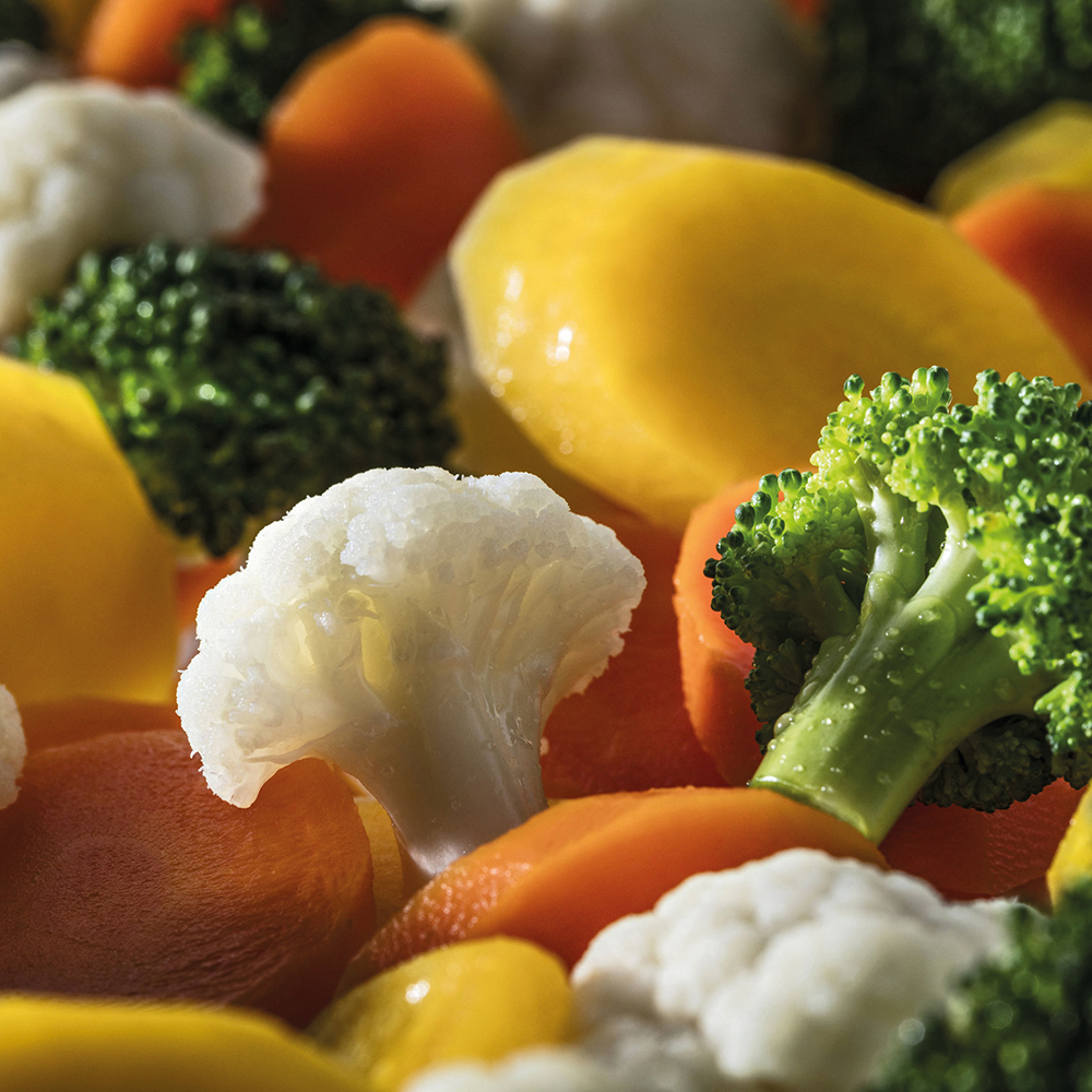 Gemüse in veränderlichen Gewichtsanteilen : Blumenkohl, Broccoli, orange und gelbe Karotten. Spuren von Sellerie möglich