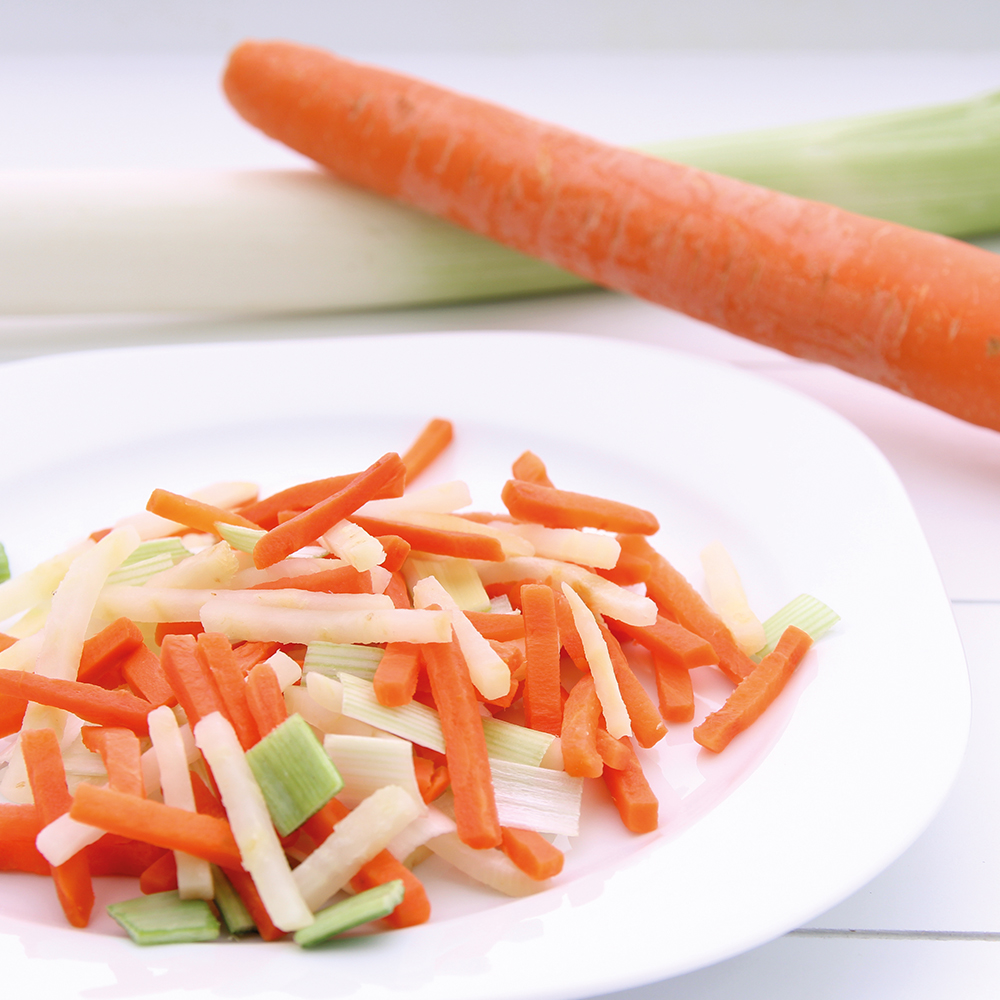 blanchiert, Karottenstifte, Selleriestifte, Porree grün/weiß in Streifen geschnitten