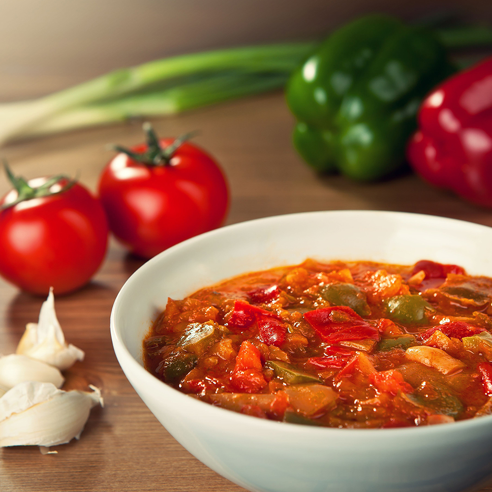 Grüner und roter Paprika (36 %), Wasser, Tomatenpüree (10 %), Zwiebeln, Zucker, Pflanzenöl (Sonnenblumenöl), Kartoffelstärke, Jodsalz, Gewürze (Jodsalz, Maltodextrin, Zwiebelpulver, Knoblauchpulver, Gewürze, Gemüse). Öl), Paprikapulver