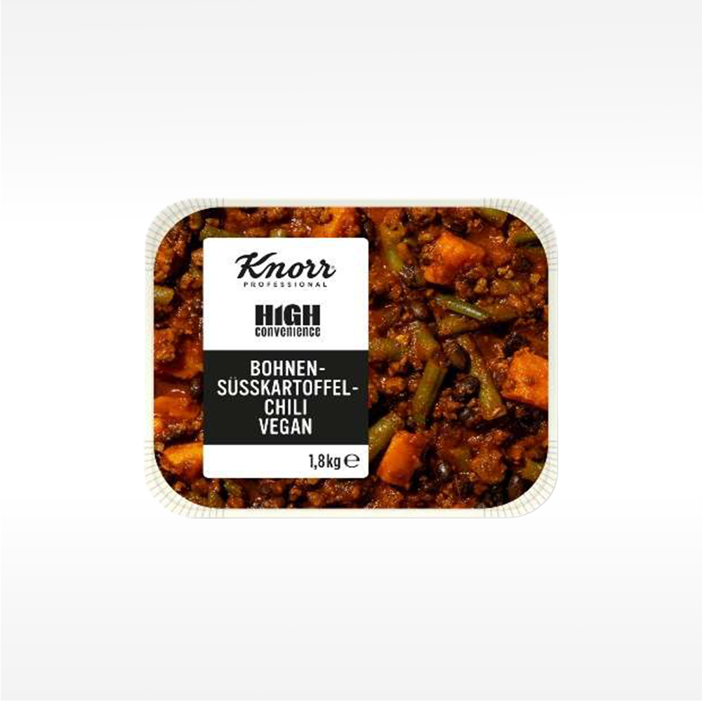 Trinkwasser, Tomatensauce (Tomatenpüree, Tomatenmark, Tomatenwürfel, Sonnenblumenöl, Zucker, Zwiebeln, Speisesalz, Säureregulator (Citronensäure)), 13% veganes Gehacktes/Faschiertes auf Soja-Basis (Sojabasis (Trinkwasser, SOJAEIWEISS), Sonnenblumenöl, Branntweinessig/Weingeistessig, Hefeextrakt, Stärke, Speisesalz, natürliche Aromen, Zwiebelpulver, GERSTENMALZEXTRAKT, Pfeffer, Zucker, Säuerungsmittel (Milchsäure), Knoblauchpulver, Verdickungsmittel (Konjakgummi)), 11% schwarze Bohnen vorgegart (Trinkwasser, schwarze Bohnen), 11% grüne Bohnen, 10% Süsskartoffeln, Zwiebelpüree, Saucenpulver (Maltodextrin, Stärke, jodiertes Speisesalz, Aromen, Tomatenpulver, Karamellzuckersirup/Caramelzuckersirup, Maiskeimöl, Gewürze, Zwiebelpulver), Sonnenblumenöl, Zitronensaft aus Zitronensaftkonzentrat, Zucker, Speisesalz, Peperoni/Peperoncini, Kreuzkümmel/Cumin.