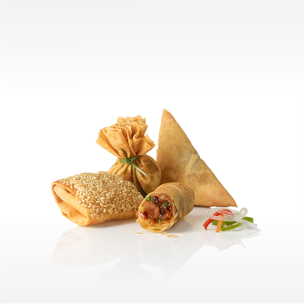 Klassisches Quartett: Asiatische Finger-Food-Lieblinge in vier typischen Formen und authentischen Füllungen – von vegetarisch über Shrimp bis Ente. SHRIMP SESAM WAN-TAN Gefüllte Sesam-Teigtasche mit saftigen Garnelenstückchen, verfeinert mit aromatischem Koriander, gegart. CHIK’N MONEY BAG Ein echter Hingucker! Teigsäckchen, gefüllt mit zartem Hähnchenfleisch, Weißkohl und Garnelen, gegart. DUCK SPRING ROLL Gefülltes Teigröllchen mit Entenfleisch, Zwiebeln und Frühlingszwiebeln in asiatischer und Frühlingszwiebeln in asiatischer Hoisin-Sauce, gegart. VEGETABLE THAI SAMOSA Feine Glasnudeln, Gemüse und ein frischer Hauch Lemongras machen dieses Teigtäschchen aus Thailand zu einem besonderen Vergnügen für alle Asien-Fans.