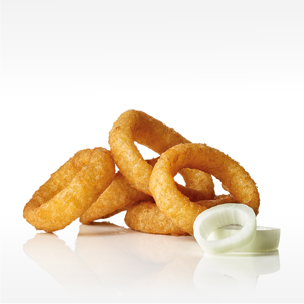 Extra breit geschnittene, saftige Ringe aus ganzen Zwiebeln im vorgebackenen Bierteig. Die Zubereitung macht sie mild, sodass zusammen mit dem Bieranteil (9%) eine pikante Süße entsteht, vorgebacken.