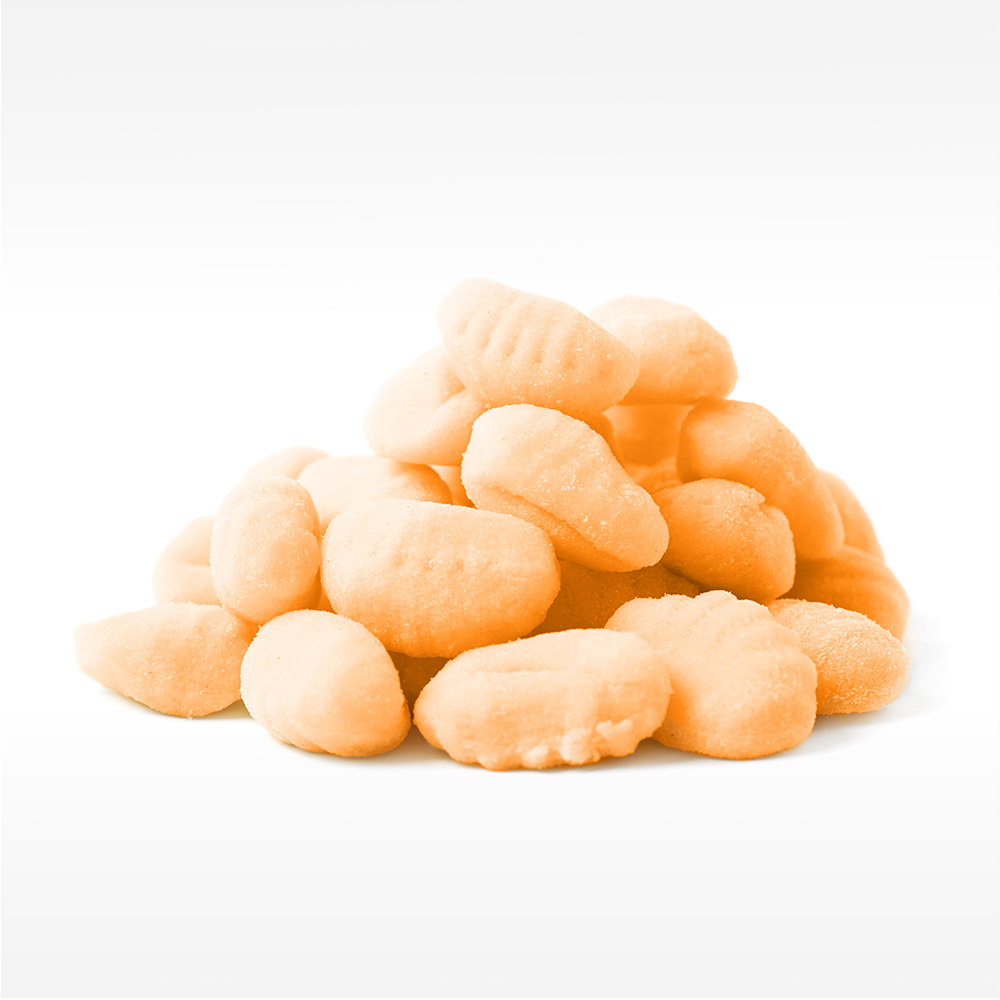 Kartoffelpüree 65% [Wasser, Süßkartoffeln 12%, Kartoffelstärke, Kartoffelflocken (Kartoffeln, Emulgator E471, Konservierungsmittel: Natriummetabisulfit E223, Kurkuma, Paprikaextrakt)], Weichweizenmehl Typ “0”, Weichweizengrieß, Maismehl, Reismehl (zur Bestreuung), Honig, doppelte konzentriertes Tomatenmark, jodiertes Salz, Kurkuma