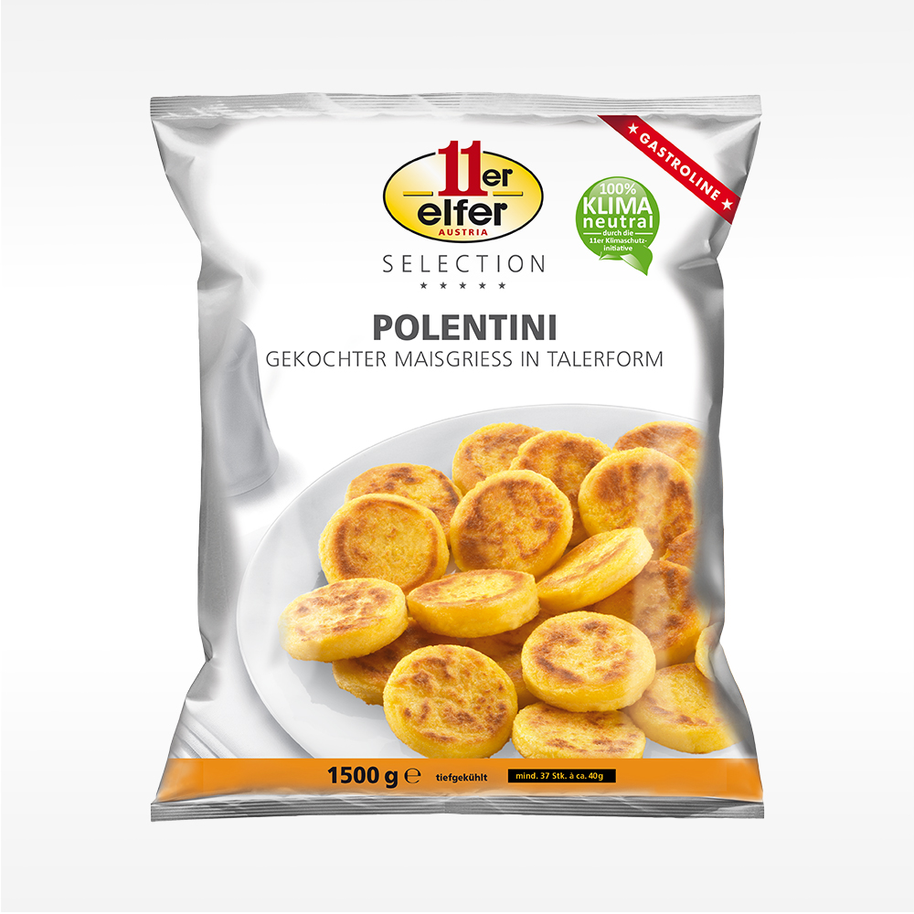 Polentataler aus gekochtem Maisgrieß, gleichmäßig rund geformt, goldgelbe Farbe. Nicht vorgebacken, ca.40g