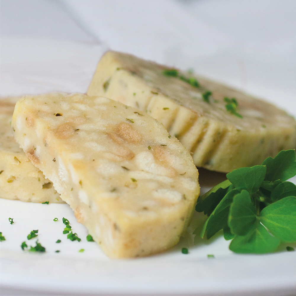 gekocht, geschnitten, Geschmack nach Ei, Petersilie und Zwiebeln, flaumig, locker