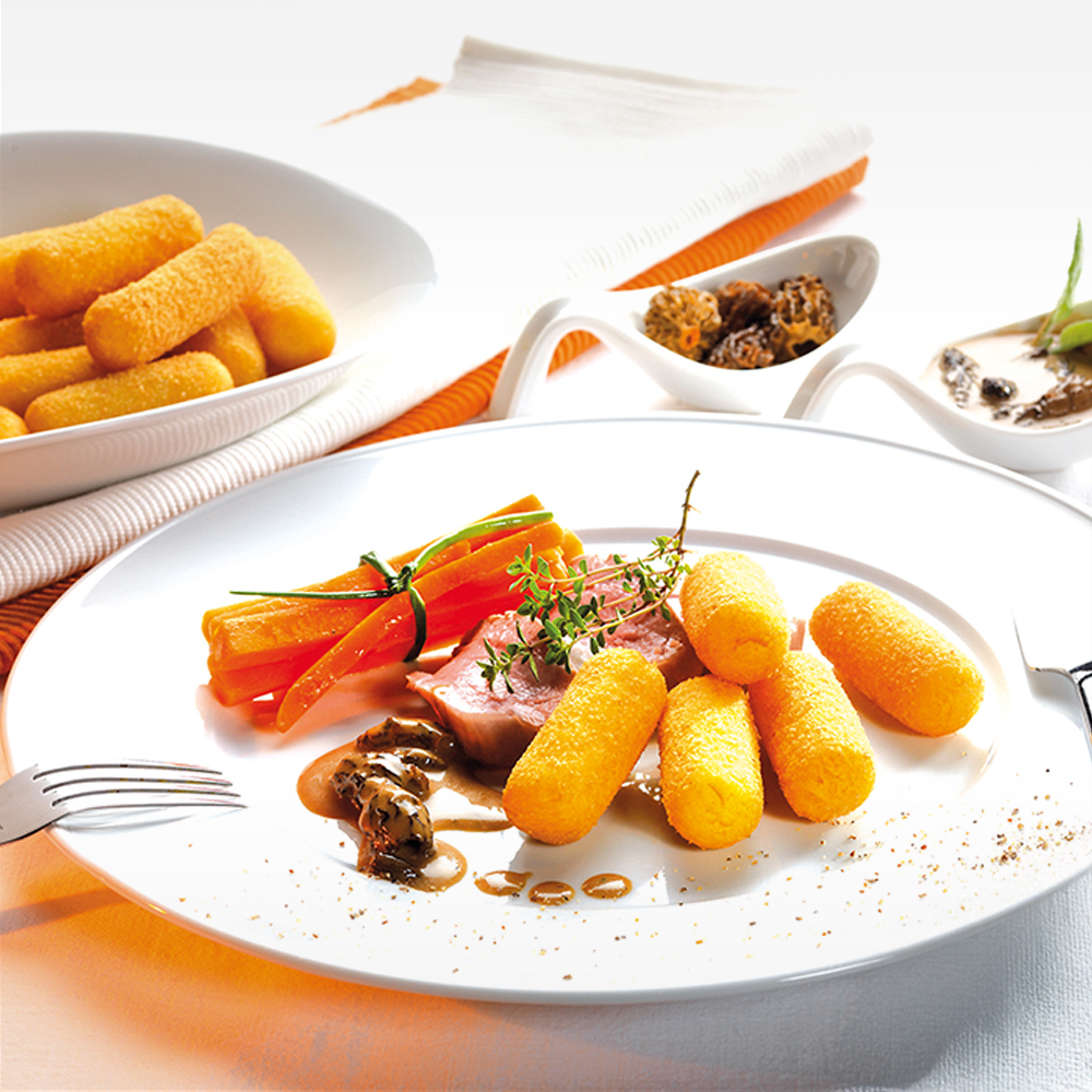Bröseln umgeben. Kartoffelmasse hellgelb, ohne Grauverfärbung. Leicht vorgebacken in Pflanzenöl, tiefgekühlt