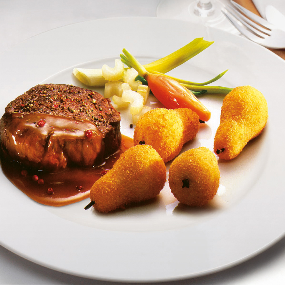 Birnenförmig geformte, panierte Kartoffelmasse.