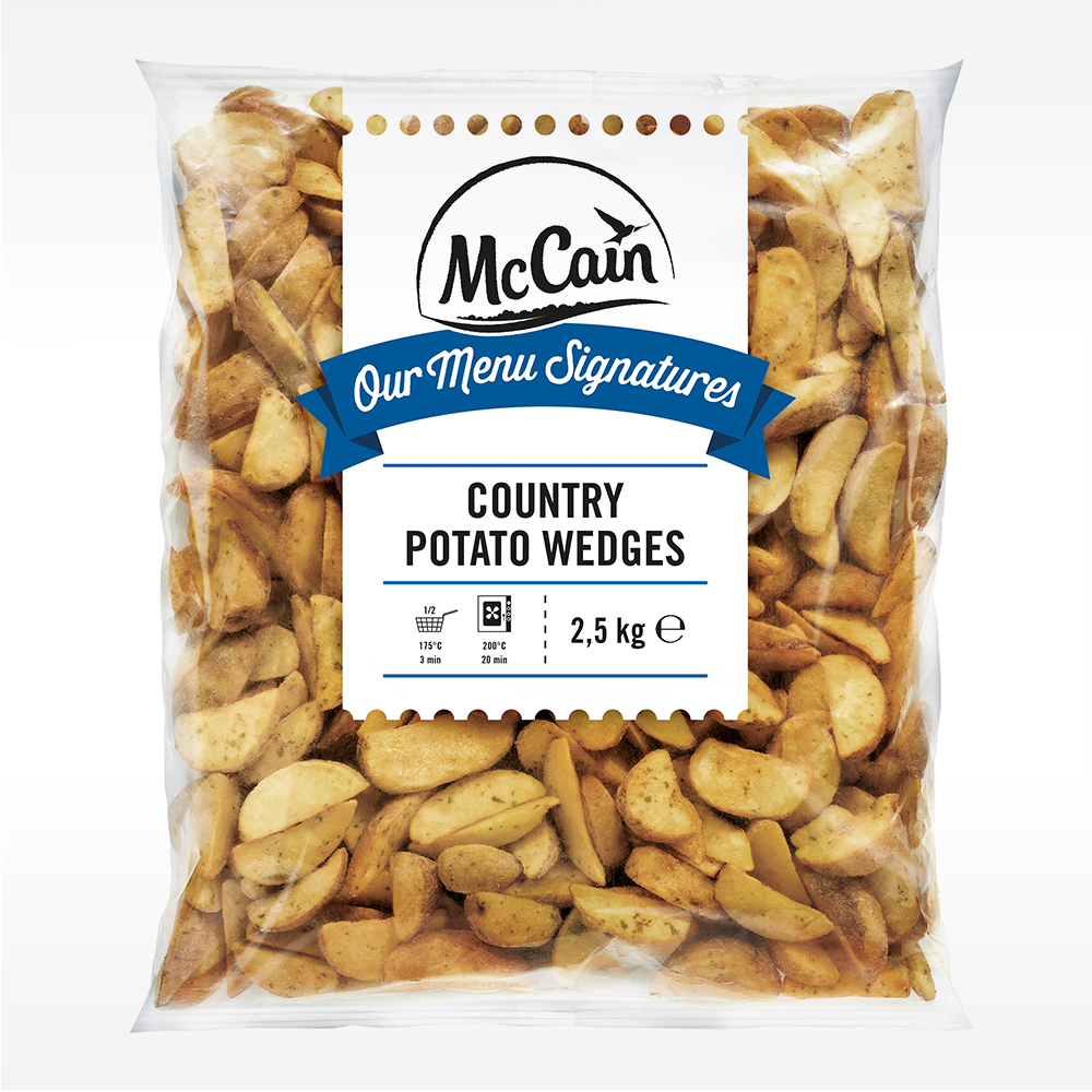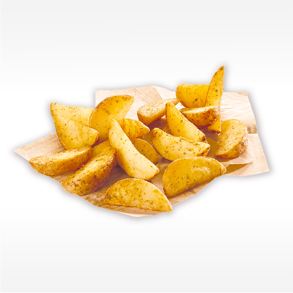 Kartoffelecken mit Schale in einer knusprig-würzigen Umhüllung, vorgebacken. 5 Säcke à 2,5kg / Karton.