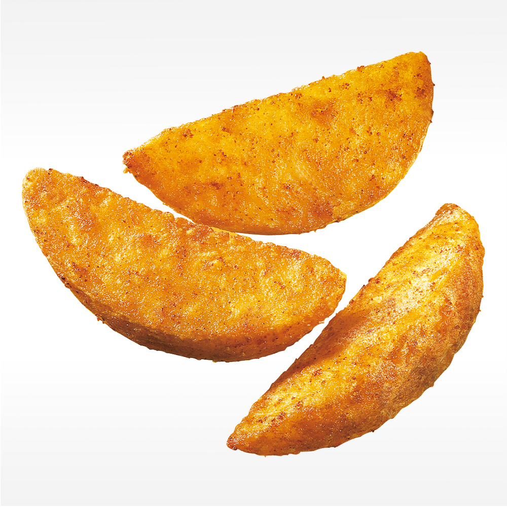 Kartoffelecken mit Schale und knuspriger, würziger Ummantelung, vorgebacken. 5 Säcke à 2,5kg / Karton.