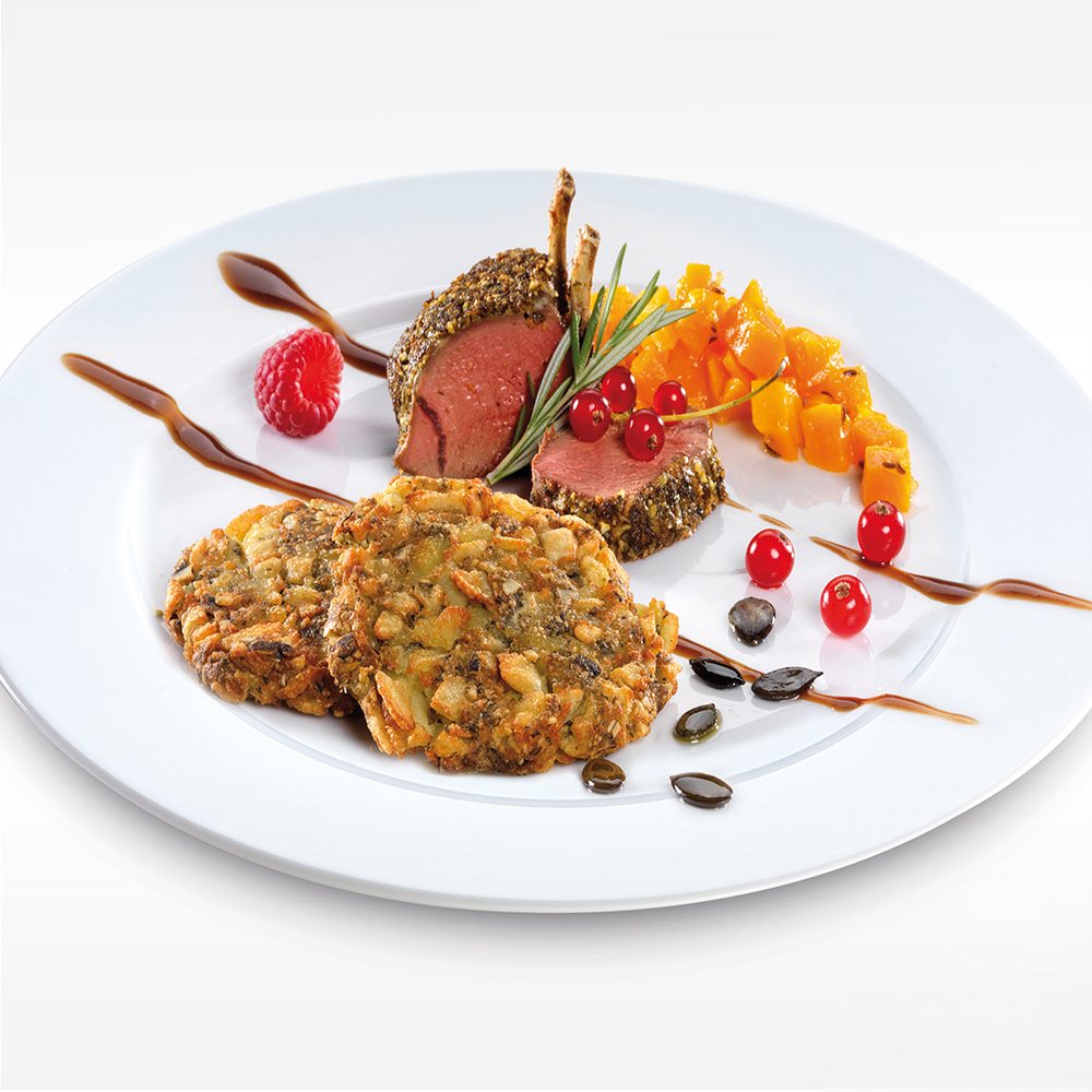 Kartoffeln 81%, Sonnenblumenöl, Kürbiskerne gehackt 6%, Kartoffelstärke, Würzmittel (Salz, Stärke,