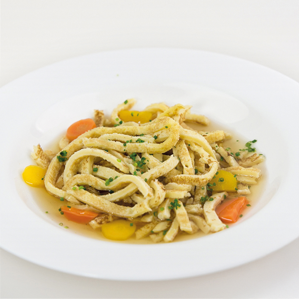 | Die tiefgekühlten Frittaten auftauen, mit heißer Suppe übergießen und servieren |