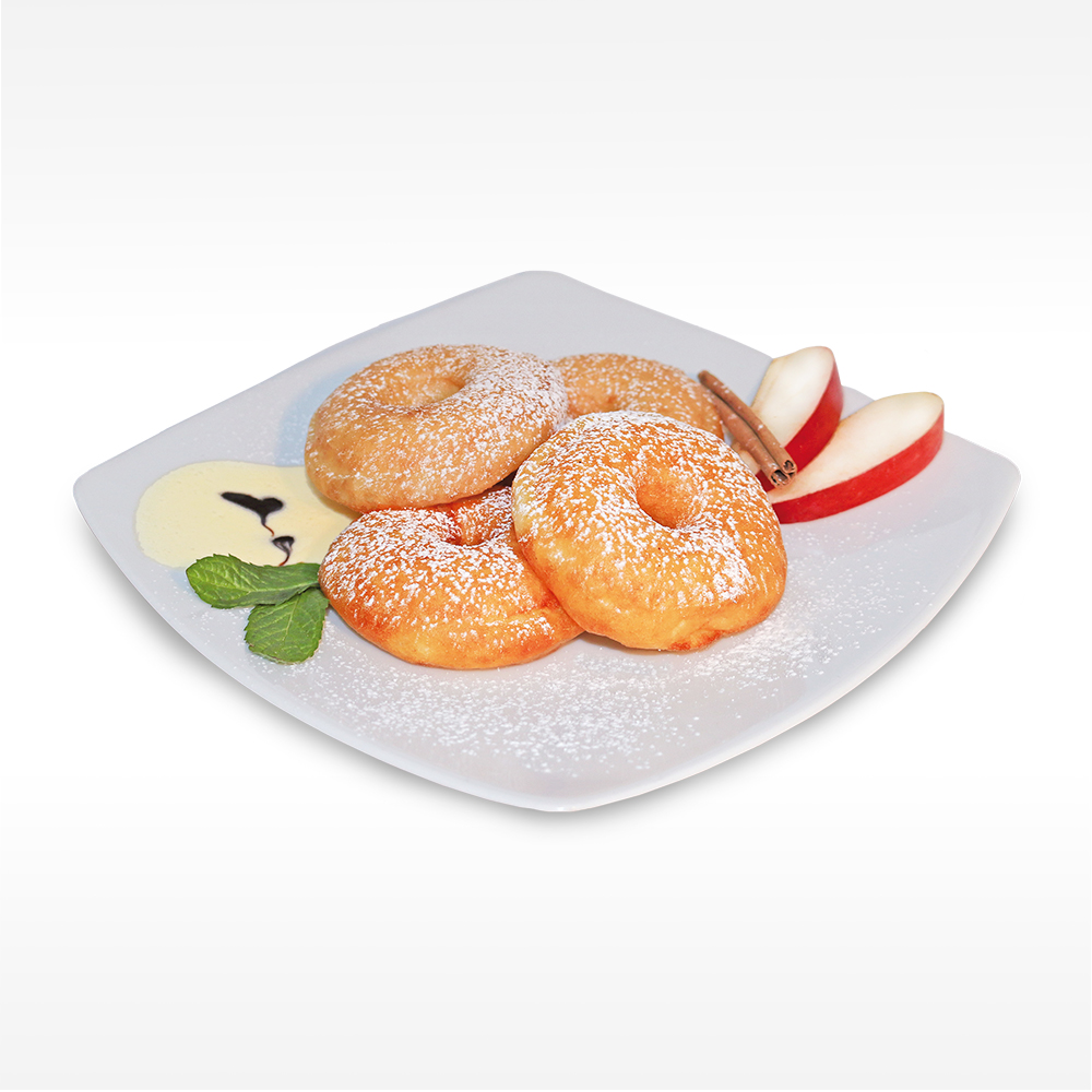 Apfelküchl / Apfelringe, aus frischen Äpfeln zubereitet und mit feinem Backteig ummantelt, fertig gebacken, tiefgefroren