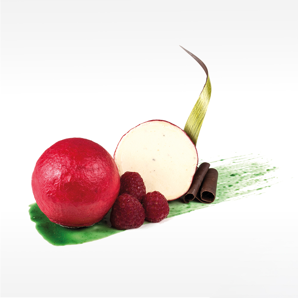 Schlagobers, Schokolade weiß (Zucker, Kakaobutter, Vollmilchpulver, Emulgator: Sojalecithin, natürliches Vanillearoma), Vollei pasteurisiert, Himbeermark (13,5%), Wasser, Zucker, Orangensaft, Gelatine, Kakaobutter (Kakaobutter, Farbstoff: Allurarot AC*), Tonkabohne (0,45%), Bourbon Vanille