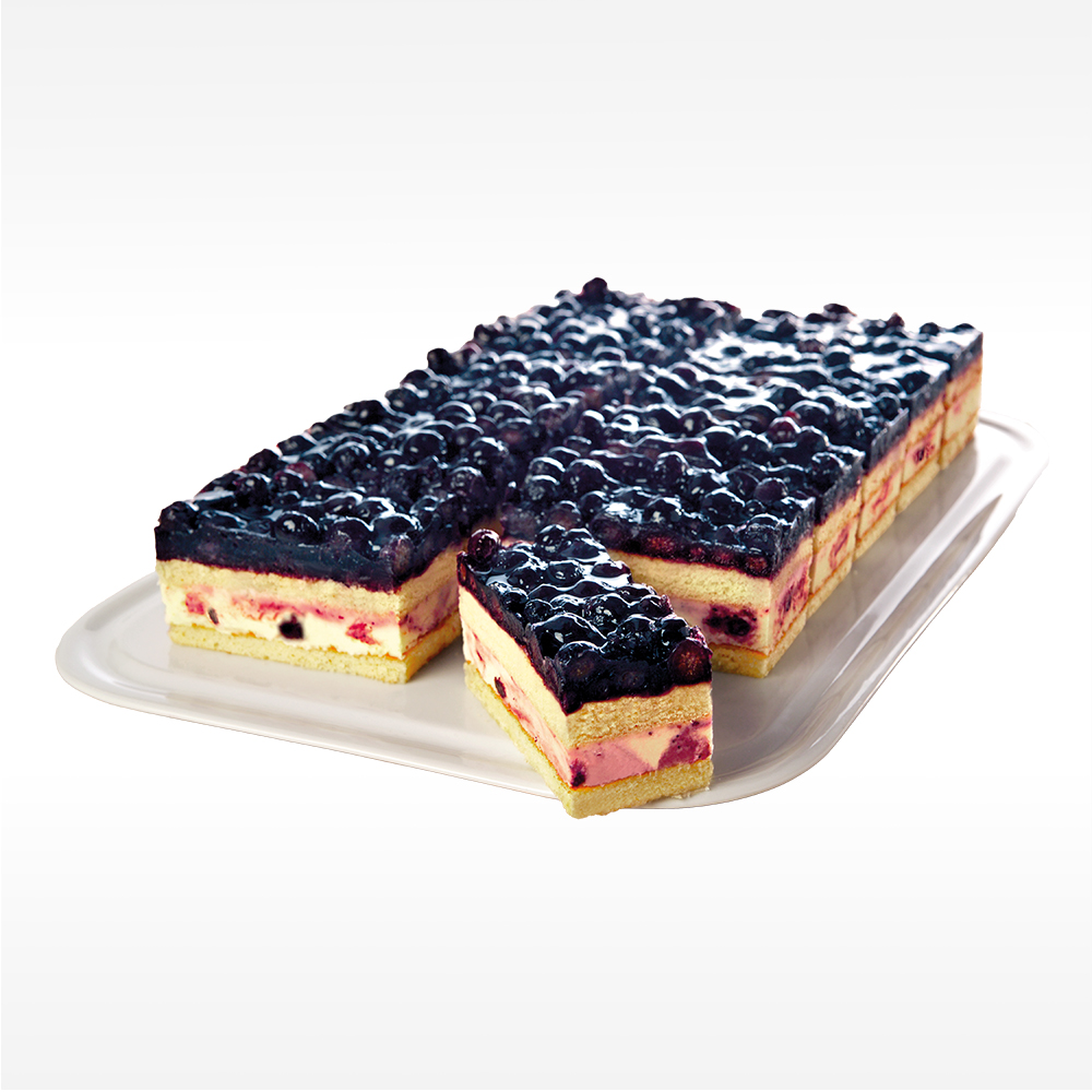 Zartes Buttermilch-Obers, verstrudelt mit köstlicher Heidelbeer-Oberscreme mit Heidelbeerstückchen, liegt zwischen zwei Rührteigböden. Darauf große Heidelbeeren, gehalten von einem aromatischen Geleeguss. Vorgeschnitten in 12 Stücke, 1.750 g, 20 x 30 cm