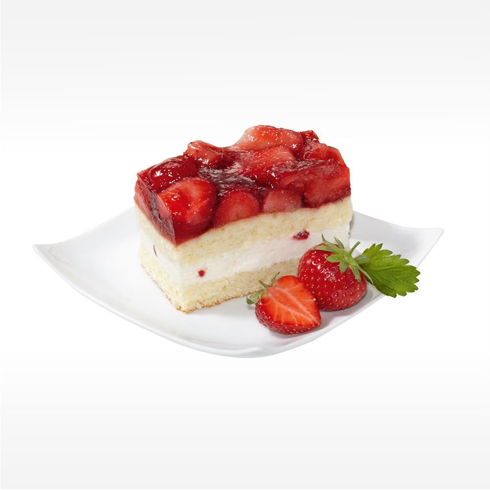 Das schmeckt nicht nur zur Erdbeerzeit! Cremige Käse-Sahne sowie Erdbeerwürfel liegen zwischen hellen Rührteigböden. Mit leckeren Erdbeeren belegt und mit aromatischem Tortenguss abgeglänzt. Vorgeschnitten in 12 Stücke, 2.100 g, 20 x 30 cm