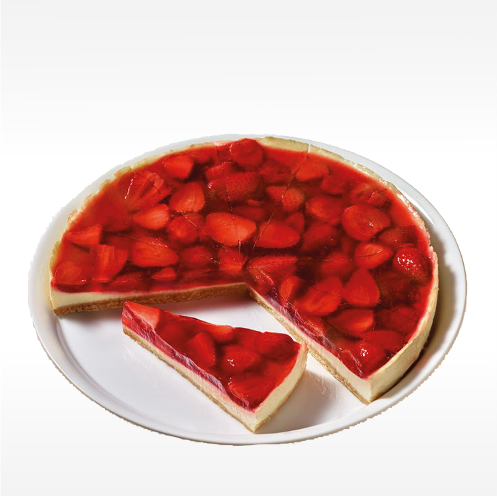Brösel-Mürbteigboden mit Käsemasse und halben Erdbeeren, mit Tortenguss abgeglänzt, tiefgefroren. Vorgeschnitten in 12 Stücke, 1.500 g, Ø 28 cm