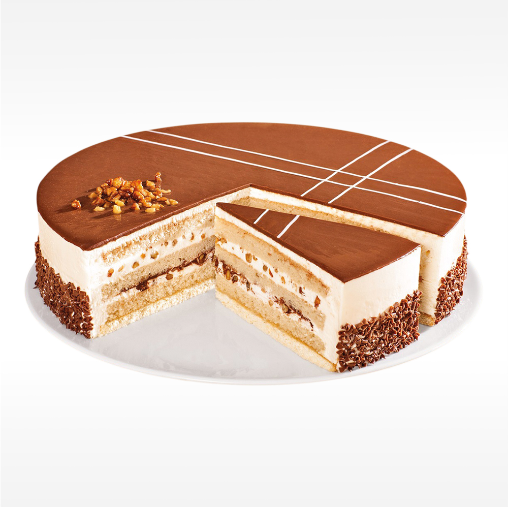 Schokoladencreme. Die Randgarnierung besteht aus Milchschokoladen-Rondies. 2.250 g, Ø 28 cm
