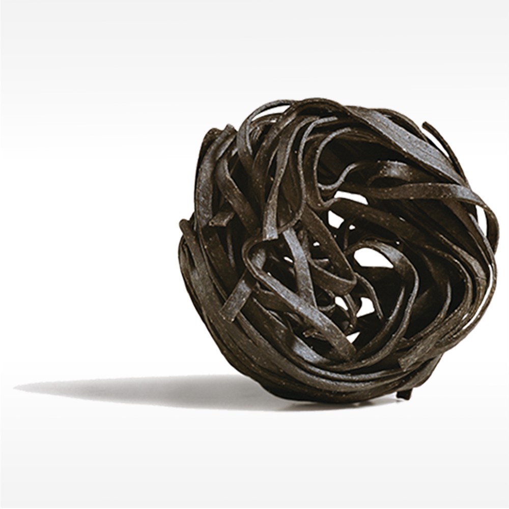FRISCHE, TIEFGEKÜHLTE EIER-PASTA MIT SCHWARZER SEPIA TINTE, ZUTATEN: Hartweizengriess, Eier 18%, WASSER, SCHWARZE Sepia-TINTE 1% (SCHWARZE Sepia-TINTE, WASSER, SALZ), SALZ. enthält Spuren von: Fisch und Fischprodukte.