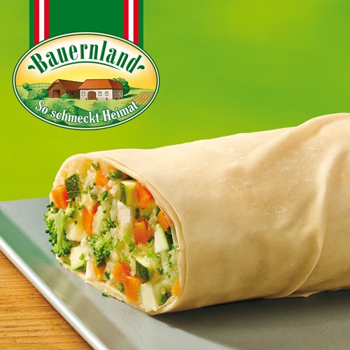 Gemüsestrudel ungebacken und im Ganzen. Gemüsefüllung aus Karotten, Erbsen, Schnittbohnen, Karfiol, Kohlrabi, weiße Rüben, Brokkoli, mit Käse verfeinert