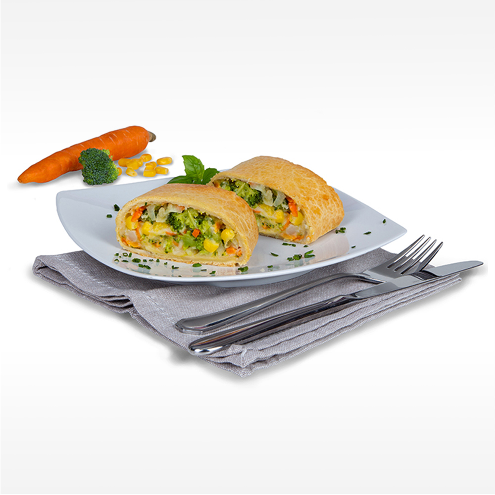 Fertig gebackener Gemüsestrudel,herzhaft gefüllt mit Gemüseallerlei und Mozzarella, portioniert, 36x80g