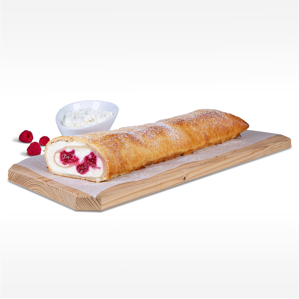 Quark-Topfen 35% (MILCH), Himbeeren 16%, WEIZENmehl, Wasser, Zucker, Pflanzenmargarine (Palmfett, Wasser, Sonnenblumenöl, Emulgator: Mono- und Diglyceride von Speisefettsäuren, Säureregulator: Citronensäure), EIweiß, modifizierte Stärke, Rapsöl, Molkenpulver (MILCH), Maisstärke, Salz, Aroma, Säuerungsmittel: Citronensäure