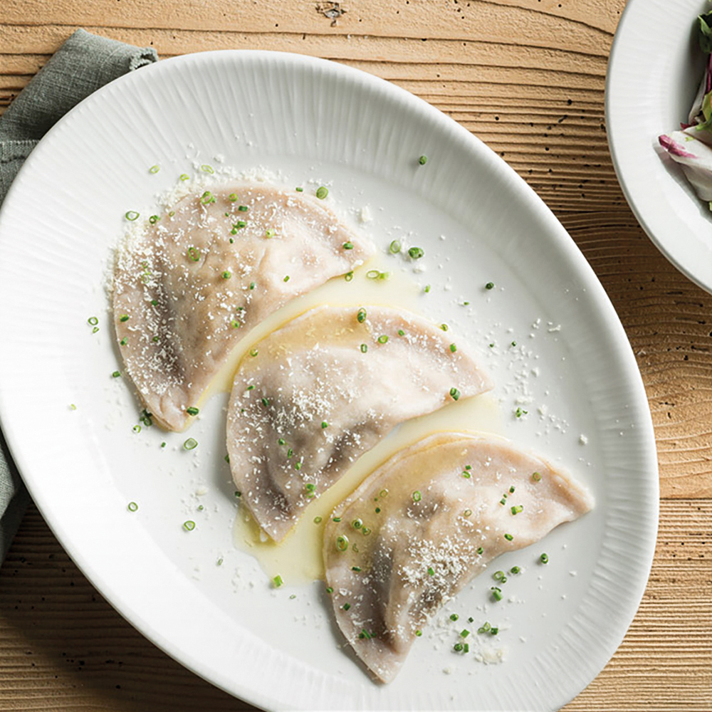 Fülle (50 %): Kartoffeln (86 %), Wasser, Zwiebel, Lauch, Speisesalz, Schnittlauch, Petersilie, Pfeffer, Muskat