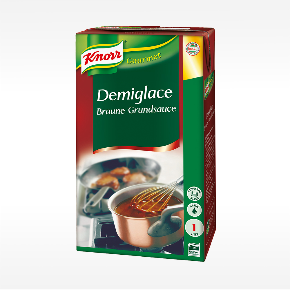 Zutaten: Trinkwasser, geröstete Rinderknochen¹, Gemüse² (Zwiebeln, KNOLLENSELLERIE), Tomatenmark, Rotwein, Knoblauch, Lorbeerblätter, Liebstöckel, schwarzer Pfeffer, Speisesalz. 1 L Demi-Glace wird hergestellt aus durchschnittlich: 2200 g gerösteten Rinderknochen¹ und 200 g Gemüse². *Mit fleischigen Knochen, Kräutern und frischem Gemüse gekocht. Sterilisiert.