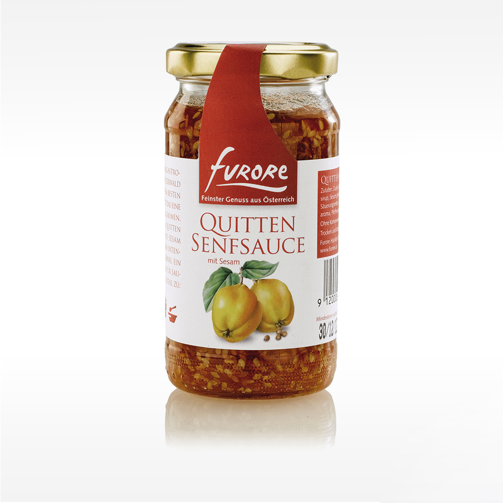Zucker, 31% Quittensaft aus Quittensaftkonzentrat, Glukosesirup, 5% gerösteter Sesam, Geliermittel: Pektin, Säuerungsmittel: Citronensäure, Pfeffer, Aroma, Senföl, Holunderbeerenextrakt, natürliches Aroma.