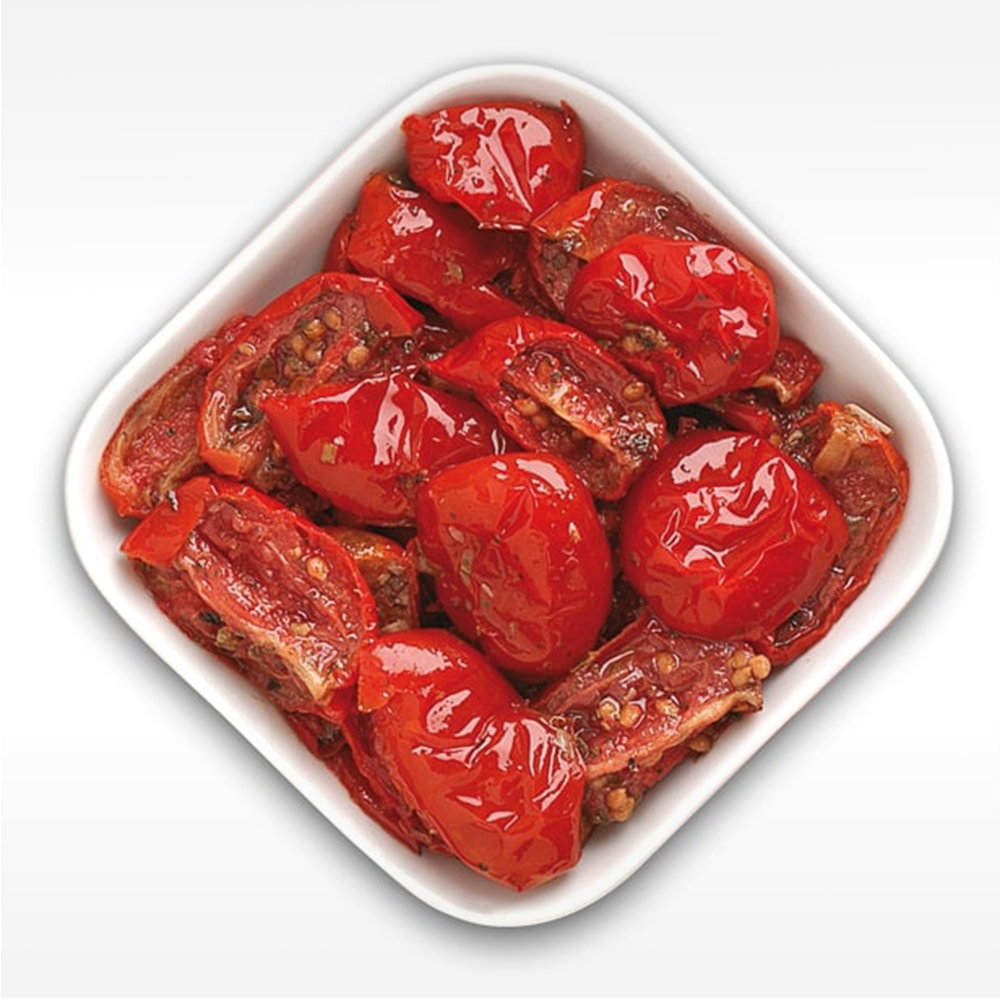 confit Tomaten (70%), Sonnenblumenöl, Zucker, Knoblauch, Salz, Kräuter, Antioxidantl: E300