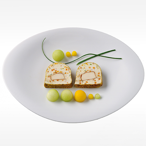 ca. 900g / Stück, Hühnerfarce mit Gemüsebrunoise, Hühnerfilet mit Paprika im Kern, ummantelt mit Curry