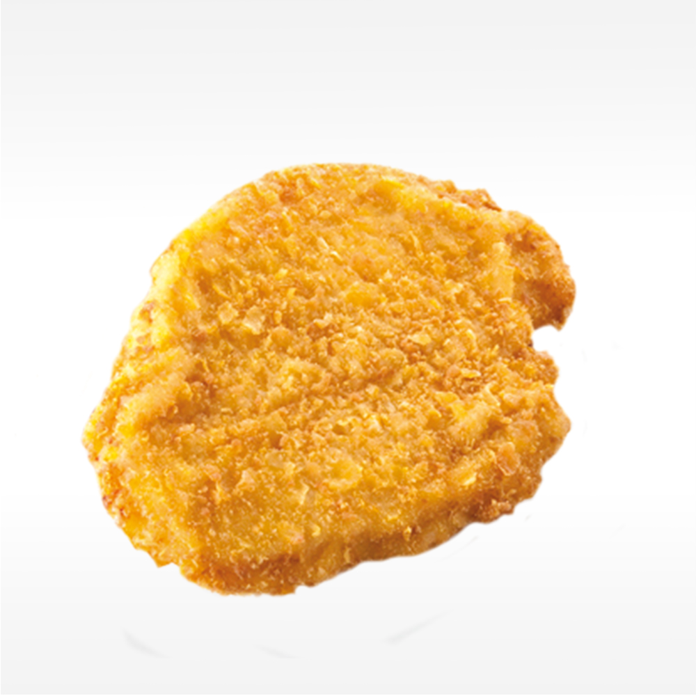 Hähnchenbrustfilet, Panadenmischung [Cornflakes (Mais, Zucker, Salz, GERSTENMALZEXTRAKT), Paniermehl (WEIZENMEHL, Salz, Hefe, Gewürze (Paprika, Kurkuma)), Nasspanade (WEIZENMEHL, Wasser), Rapsöl, Wasser, Salz, Säureregulatoren (E450, E451), Weißer Pfeffer