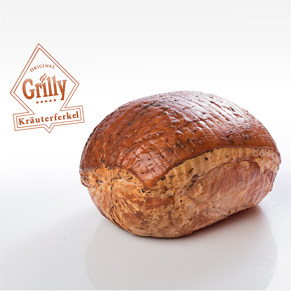 ca.2kg, ausgelöste und gerollte Kräuterferkel Keule, gewürzt, geräuchert und vorgegart